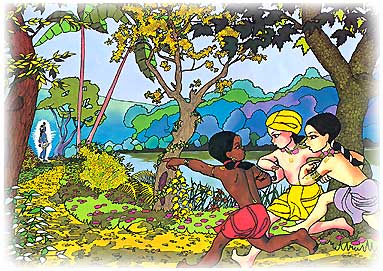 Jeder Junge schmückte sich selber mit Blumen, Blättern, Zweiglein, Pfauenfedern, rotem Lehm und anderen schönen Dingen, die sie hier und dort im Wald fanden. Immer glücklich waren die Jungen in verschiedene Spiele vertieft. Manchmal ging Gopal alleine weiter, um die Schönheit des Waldes zu bewundern. Die Jungen hinter Ihm versuchten Ihn dann einzuholen und jeder wollte der Erste sein, der Ihn erreichte. Dann rief zum Beispiel einer laut : ? Ich werde loslaufen und Ihn erreichen!" Worauf ein anderer antwortete:" Oh nein, das wirst du nicht, ich werde als Erster bei Gopal sein!" |