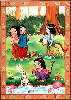 Die Kuhhirten-Jungen bemerkten nicht, wie die Kälber wegliefen. Diese gingen tief in den Wald, um dort frisches Gras zu fressen. Schon bald waren sie ganz ausser Sichtweite. Plötzlich bemerkte einer der Jungen: "Oh nein, die Kälber sind verschwunden!" Die Knaben befürchteten Schwierigkeiten zu bekommen, wenn sie ohne die Kälber nach Hause zurückkehren würden. "Was sollen wir jetzt tun?" fragten sie weinend. Gopal sagte:"Macht euch keine Sorgen. Ich habe meine Mahlzeit schon fast beendet. Ich werde selber nach den Kälbern suchen gehen. Sie können nicht all zu weit weg sein. Wahrscheinlich sind sie nur in die Wälder gegangen." |
