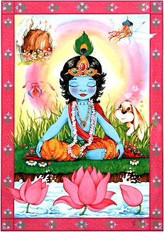 Auch wenn Gopal aussah wie einer der Kuhhirtenjungen des Dorfes Vrindavan, ist er in Wahrheit der Herr des Universums. Darum wusste er genau, wo sich die Kälber befanden. Einer der kleinen Halbgötter namens Brahma hatte sie vom Fluss weggelockt. Gopal sagte zu sich: "Bei diesem trickreichen Spiel können zwei mitspielen! Ich werde Brahma glauben lassen, dass ich nur ein gewöhnlicher, kleiner Junge bin." Gopal suchte in den Gebüschen und in den tiefen Wäldern nach den verlorenen Kälbern. Er untersuchte sogar all die nahe gelegenen Berghöhlen, dabei tat er so, als könnte er die Kälber nicht finden. |