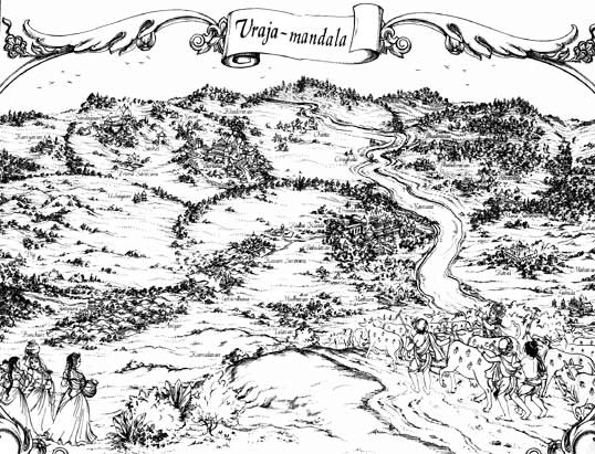 Cuando Krishna era pequeño, él vivia en Vraja, al norte de India, en donde paso los primeros 16 años de su vida. Vraja es una tierra de pastores de vacas. Ellos protejen y sirven a las vacas y su riqueza es leche y yogurt. Sus habitantes son llamados Vrajavasis. En Vraja hay 12 bosques principales y Vridavan es el preferido de Krishna. |